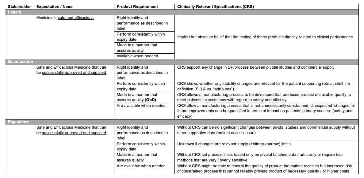 Different parts of society have subtly different expectations for medicines and how this relates to meaningful / clinically relevant specification (unambiguous test specification) (Table 1).