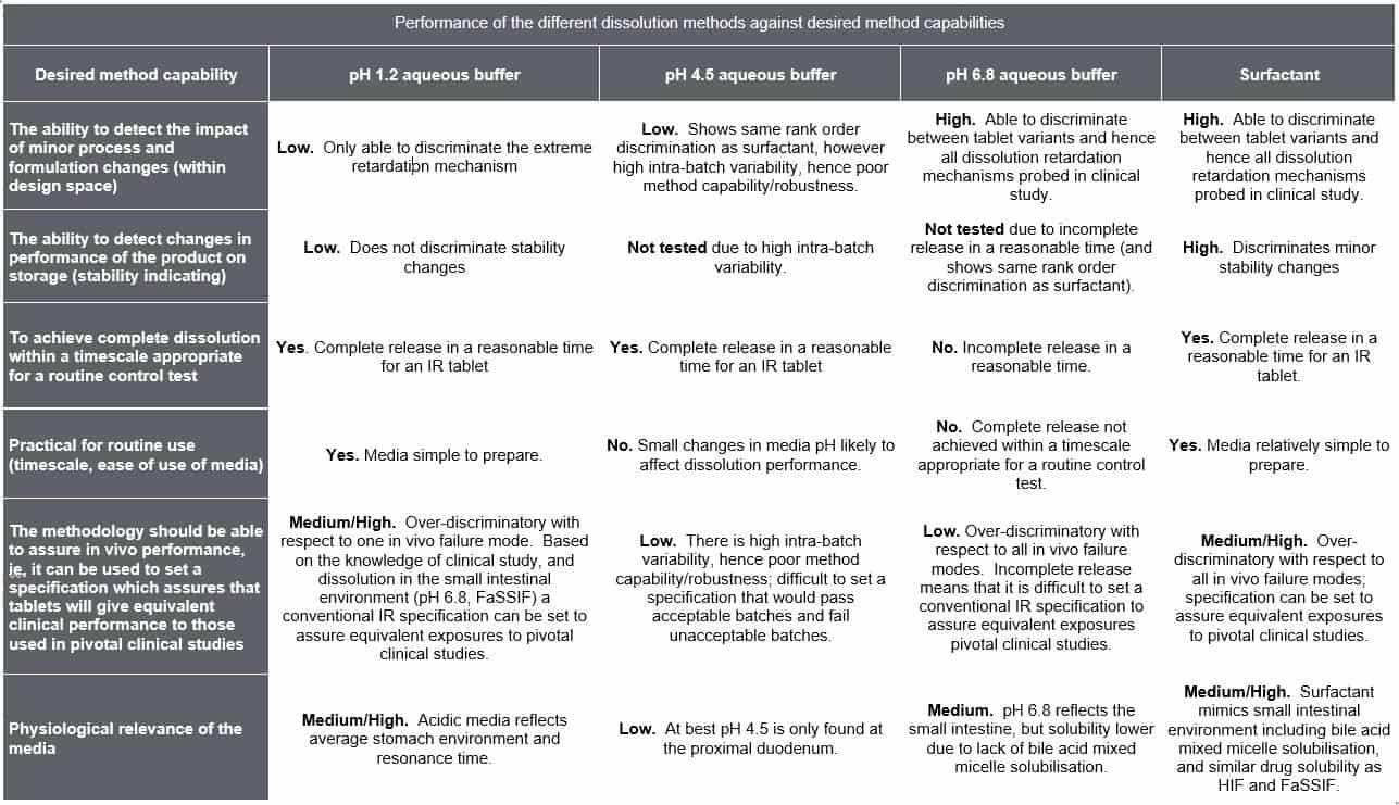 Based on these demands the dissolution test then has a number of desired capabilities (See Column 1, Table 2) and unlike an appropriately validated assay and related substance method it is possible that different dissolution methods can meet the individual method capability requirements differently (Table 1). Depending on the background of the individual considering the dissolution method they may also weight the method capabilities differently and therefore which method is most appropriate. This is a key challenge for CRDS. Although the focus of CRDS is generally on oral drug products these concepts apply equally drug products where there is a release or dissolution step.